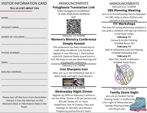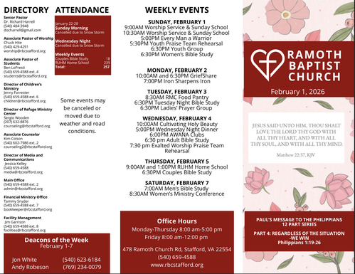 On Sunday, February 1, the church will only have one worship service at 10:30AM.