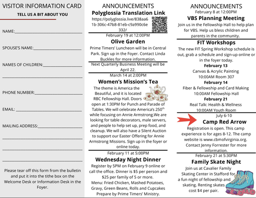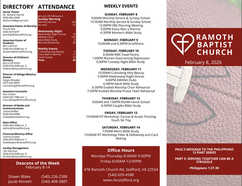 Sunday services and Sunday school will follow regular schedule February 8th.