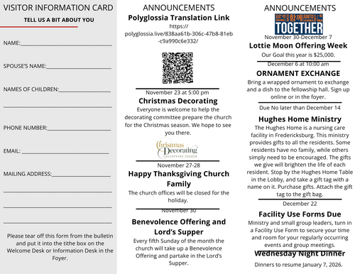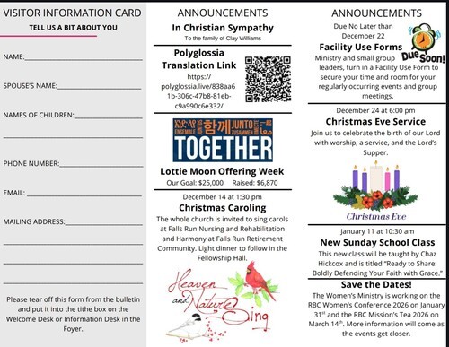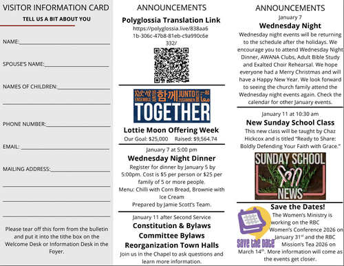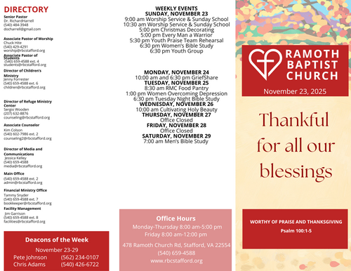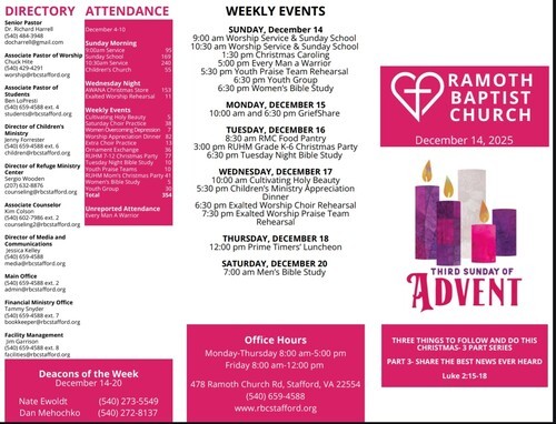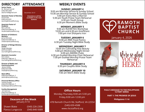 6:00 PM AWANA September to April | 6:30PM Bible Studies & Choir Practice | 7:30PM Praise Team Practice