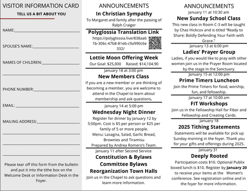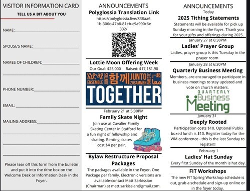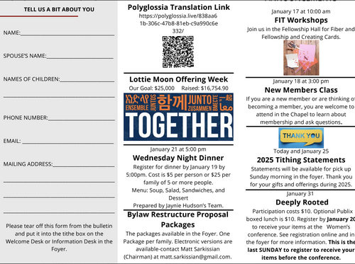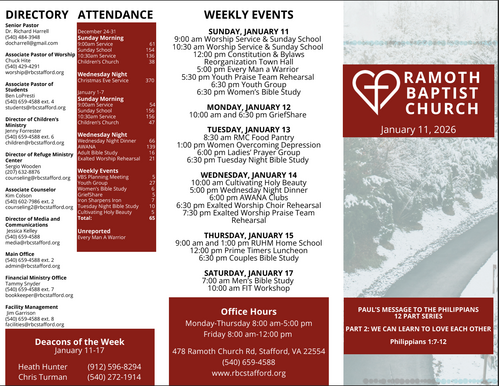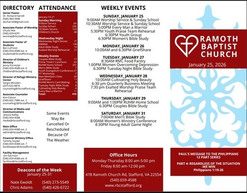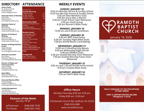 6:00 PM AWANA September to April | 6:30PM Bible Studies & Choir Practice | 7:30PM Praise Team Practice