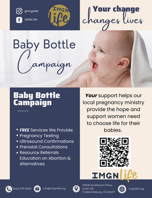 Your loose change, changes lives! The Baby Bottle Campaign for IMGN Life starts today! It’s easy to participate! Just pick up a bottle today in the foyer and fill it with coins, cash, or a check (made payable to IMGN Life). Bring it back to the church before February 23rd, and know that your giving is making a positive difference in our community.